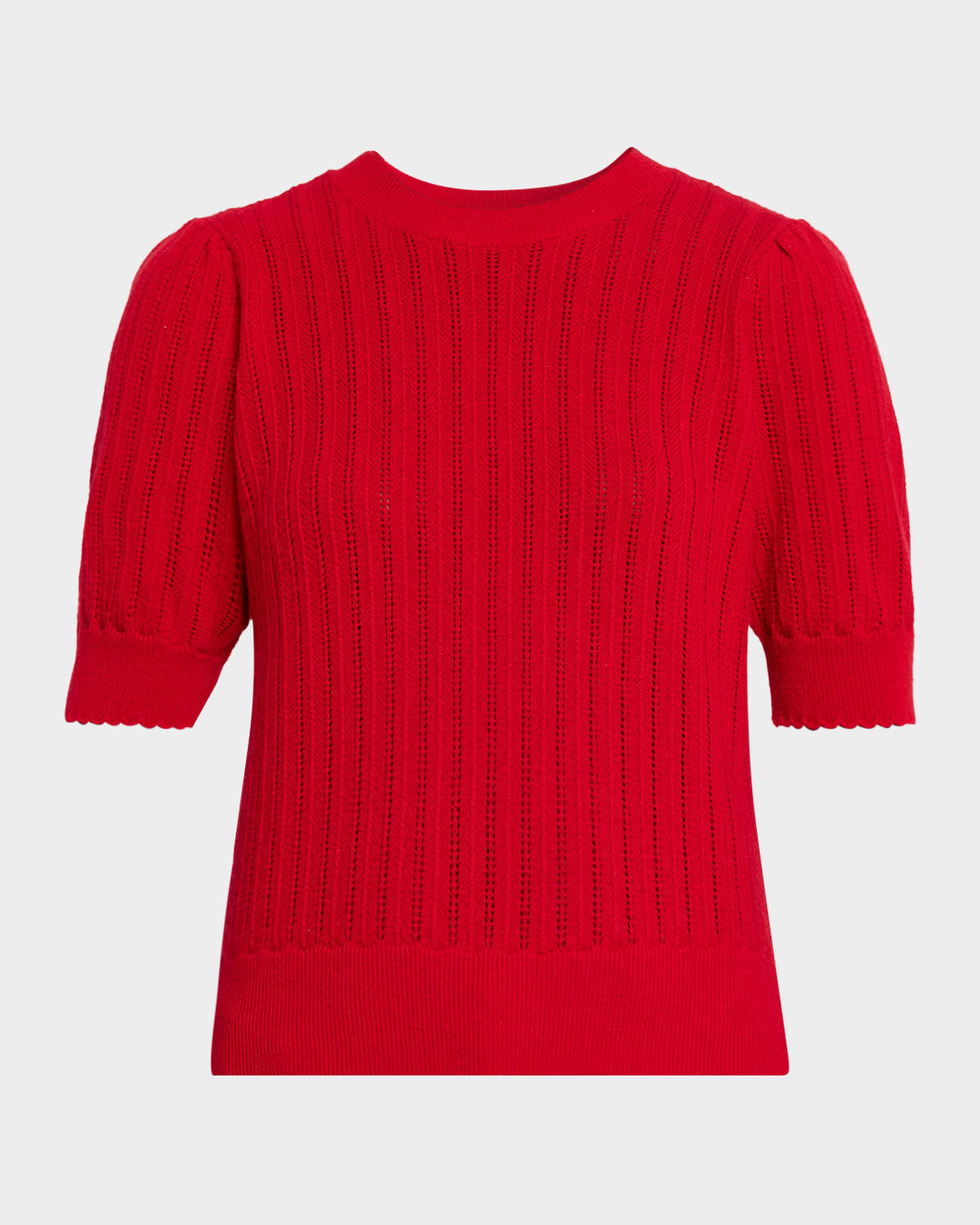 FRAME pointelle sweater crafted in luxurious cashmere Crew neckline Short sleeves Classic fit Hem sits at the hip Pullover style Cashmere Dry clean Imported