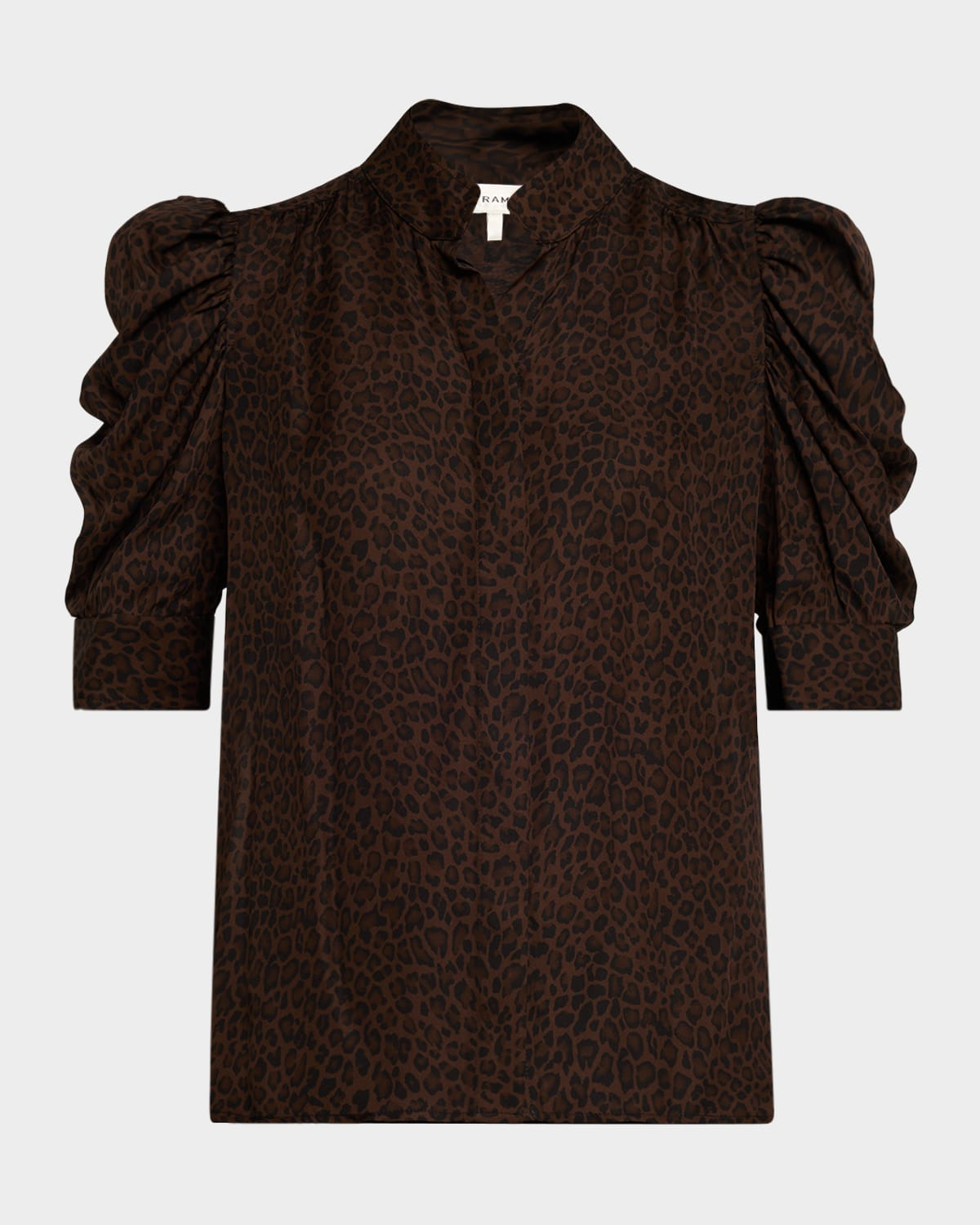 Exuding a modern romantic look, the "Gillian" blouse by FRAME is crafted from silk in a bold leopard print and framed with boldly puffed sleeves Approx. 25"L from shoulder to hem High neckline Elbowlength sleeves; button cuffs Yoked back Relaxed fit Hip length Concealed button front Silk Imported