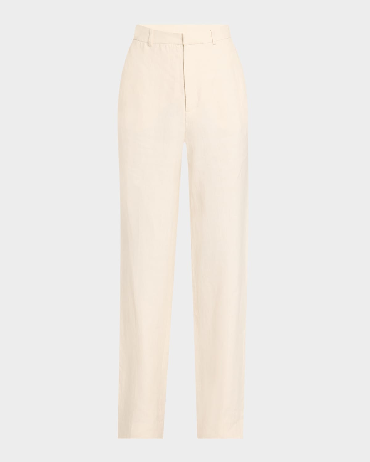 - FRAME straight-leg linen trousers - Approx. 11.5" rise; 34" inseam - High rise - Four-pocket style - Tailored fit - Full length - Hook/zip fly; belt loops - Linen/viscose - Dry clean only - Imported