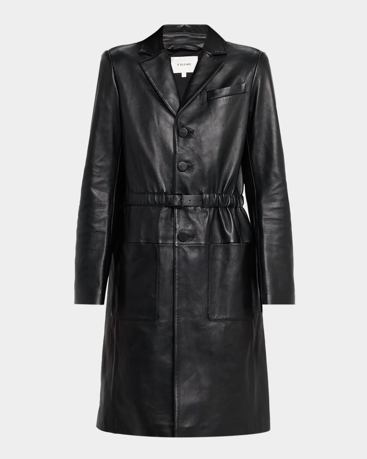 Crafted from smooth leather, the "Long Leather Belted Jacket" by FRAME is designed for everyday wear and features an adjustable belt to cinch the waist. Notched collar Singlebreasted front Chest welt pocket Long sleeves Patch pockets Classic fit Kneelength with vented back Buttonfront Leather Leather method dry cleaning Imported