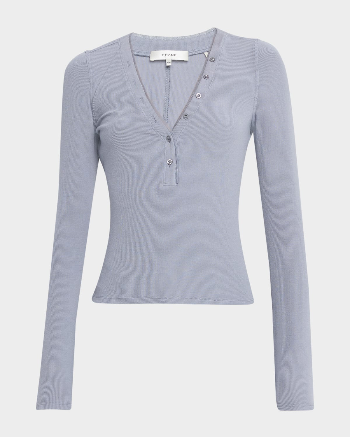- FRAME ribbed-knit Henley top finished with mesh trim along the neckline - Long sleeves - Easy fit - Hem sits at the hip - Pullover style - Modal/spandex - Hand wash or dry clean - Imported