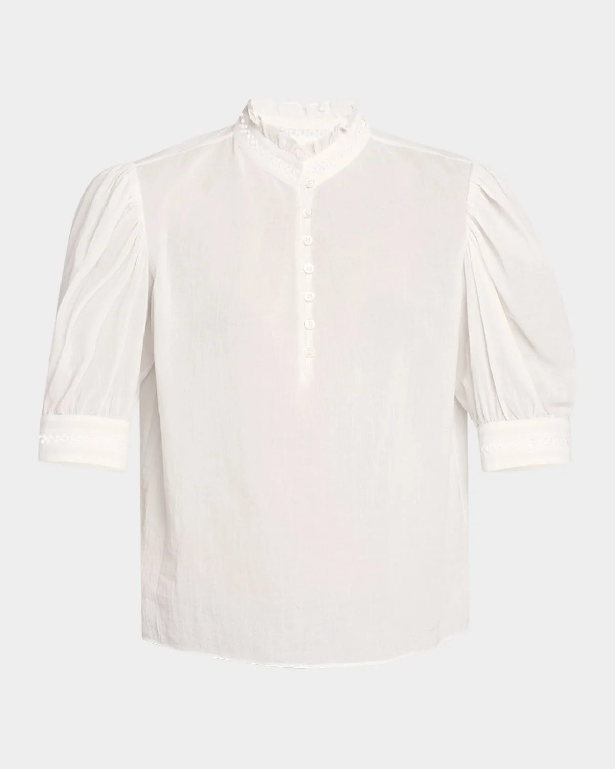 - FRAME "The Ruffle Collar Top" crafted from crisp cotton poplin - Stand collar - Short puff sleeves with button cuffs - Classic fit - Hem sits at the hip - Button-front - Cotton - Dry clean or hand wash - Imported