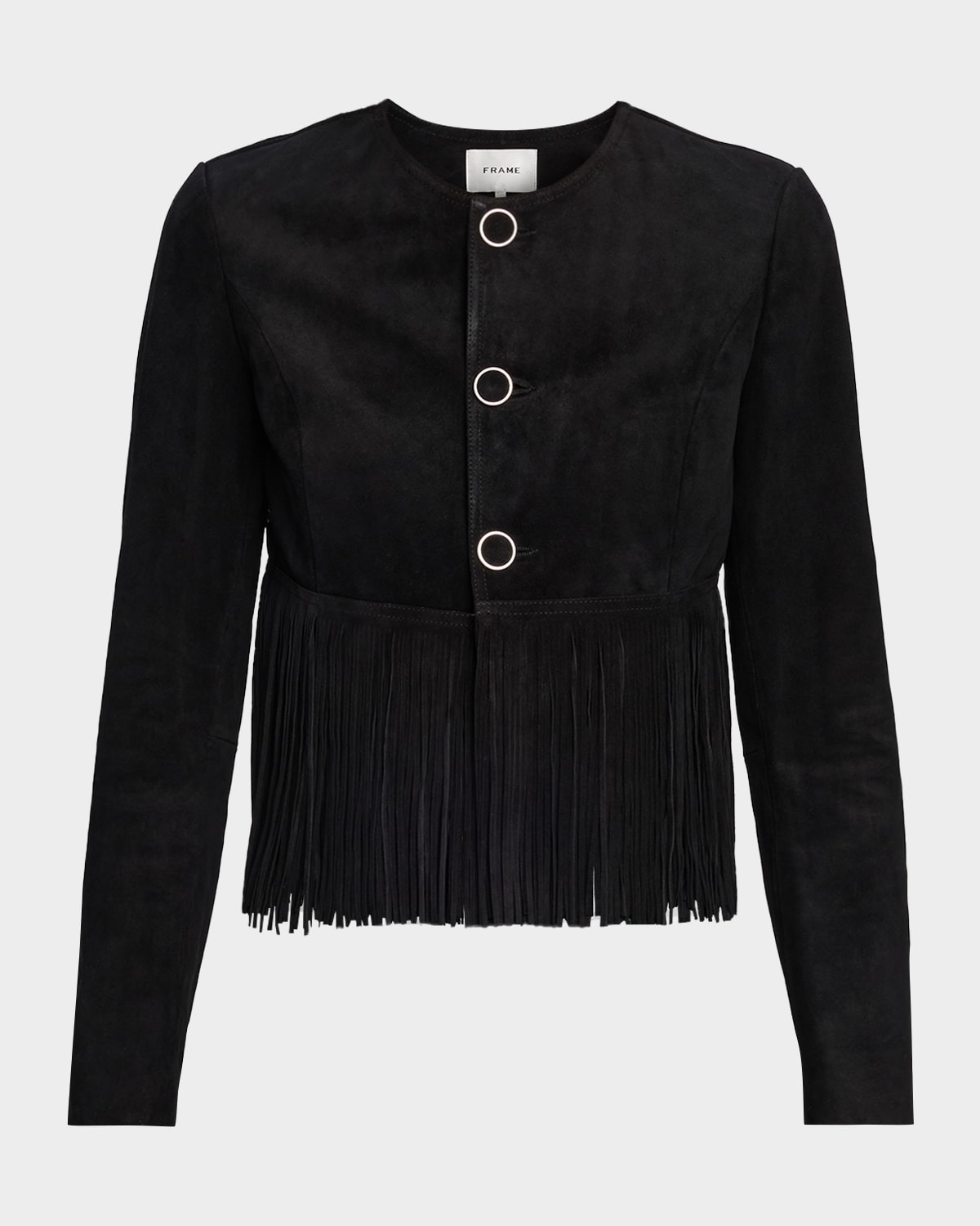 Finished with fringe, the "Saddle" jacket by FRAME is crafted from supple calf suede for a Westerninspired look that can be dressed up or down. Round neckline Long sleeves Classic fit Hem sits at the hip Buttonfront Leather Professional cleaning recommended Imported