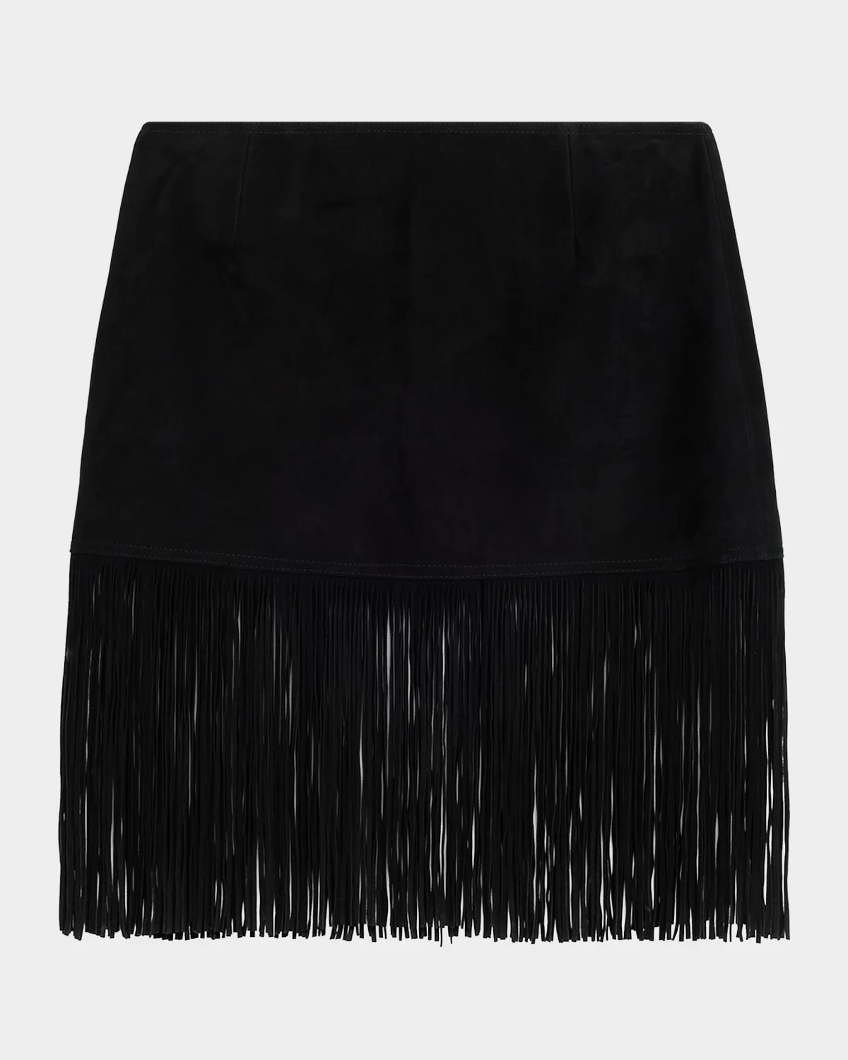 Crafted in supple calf suede, the "Saddle" mini skirt by FRAME is finished with a fringe hem that sways with every movement. High rise Skirt falls straight from hip to hem Hem falls above the knee Center back zip Leather Professional cleaning recommended Imported