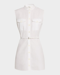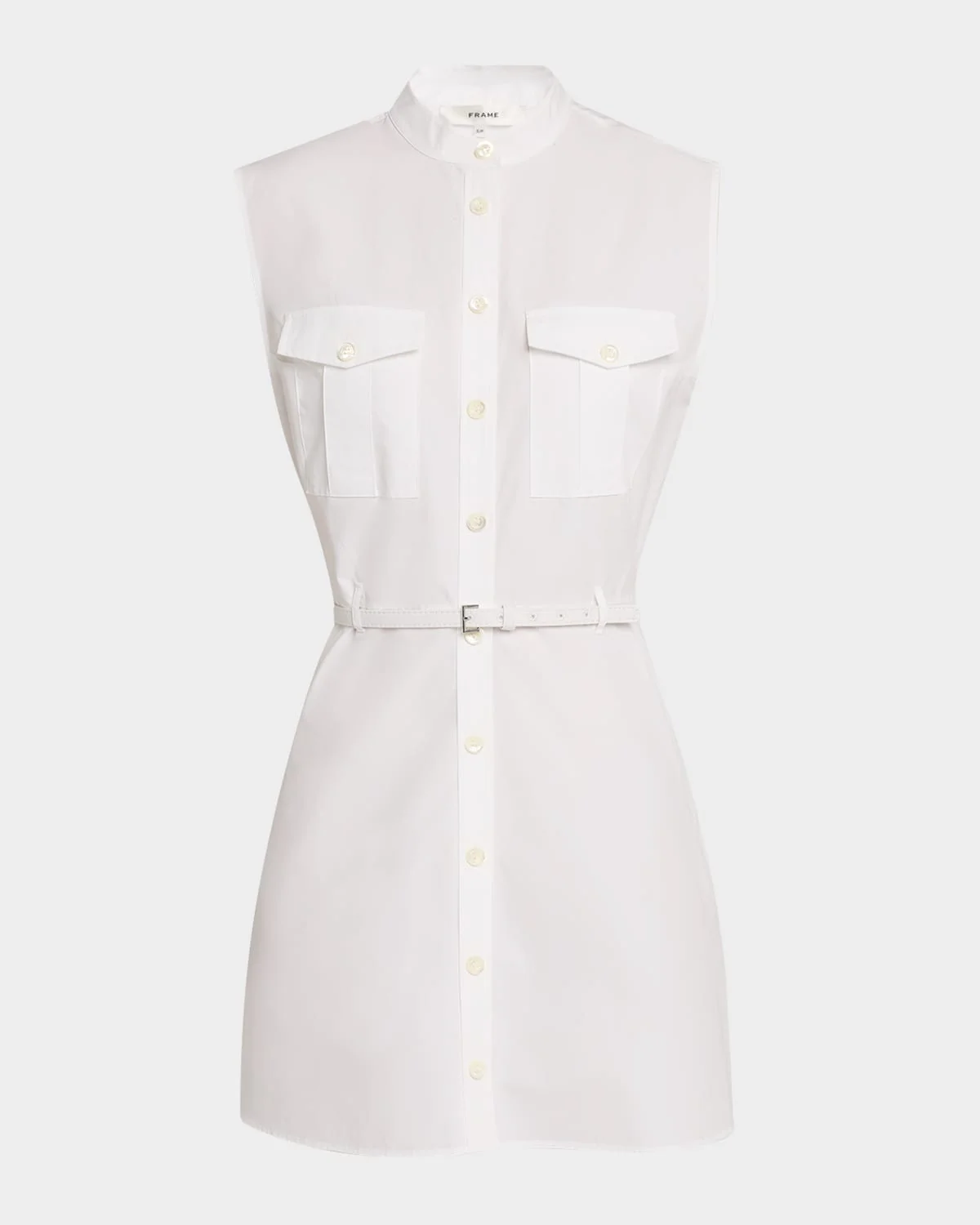 - FRAME "The Safari" mini dress featuring a belted waist - High neckline - Sleeveless - Dual chest pockets - Shirtdress silhouette - Hem falls above the knee - Button-front - Cotton - Machine wash cold - Imported