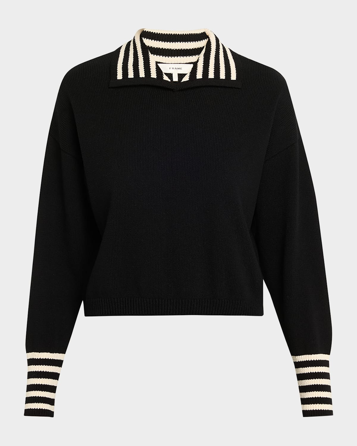 FRAME cotton sweater elevated with contrast striped trim Spread collar Long sleeves with elongated cuffs Classic fit Hem sits at the hip Pullover style Cotton Dry clean Imported