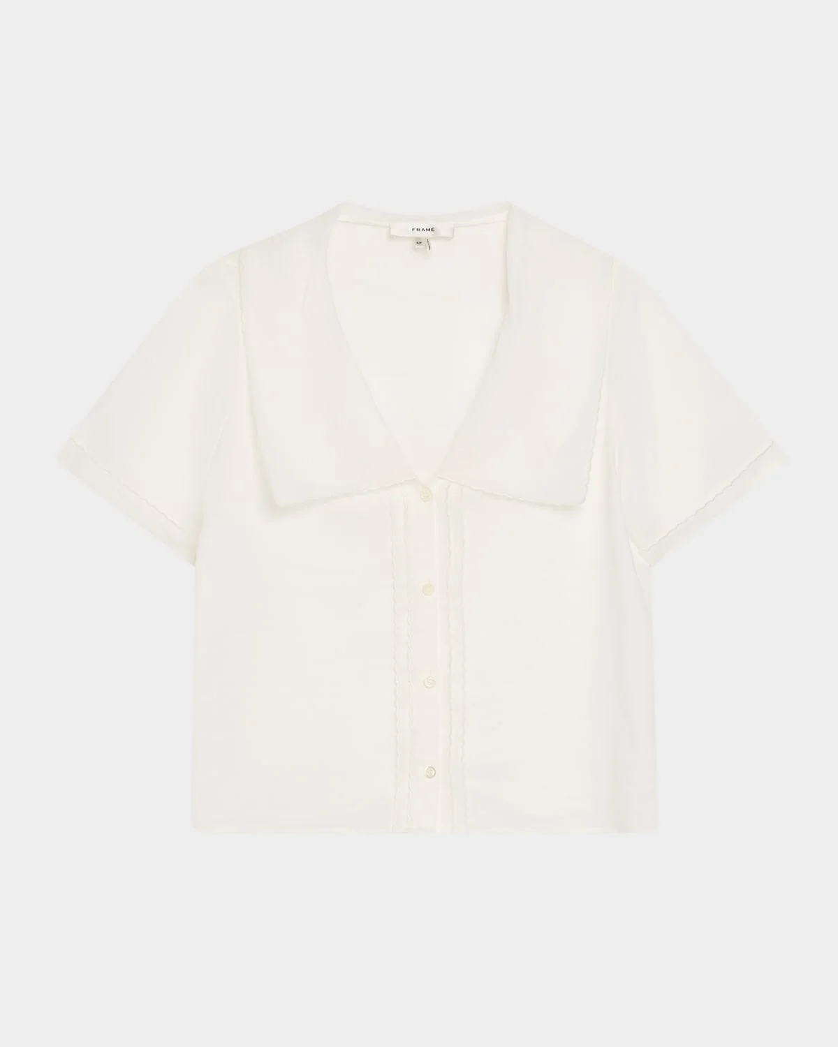 - FRAME sailor blouse in lightweight ramie - V neckline; scalloped sailor collar - Short sleeves - Classic fit - Hem falls to the hip - Button-front - Ramie - Hand wash cold, lay flat to dry - Imported