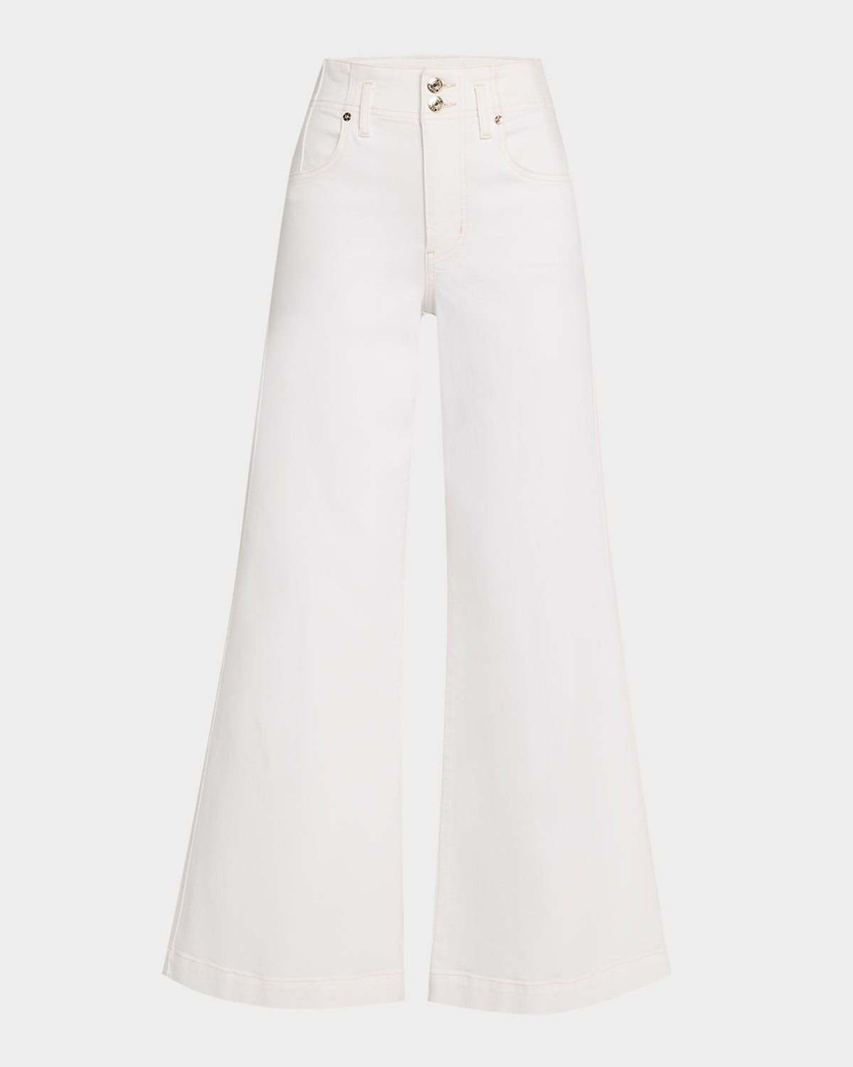 - FRAME "The Seamed Wide Trouser" jeans in crisp white stretch-denim - Approx. 11.3" rise; 32" inseam - High rise - Five-pocket style - Wide legs with a subtle flare - Full length - Two-button/zip fly; belt loops - Cotton/Promodal® rayon/elasterell-p - Machine wash warm - Imported