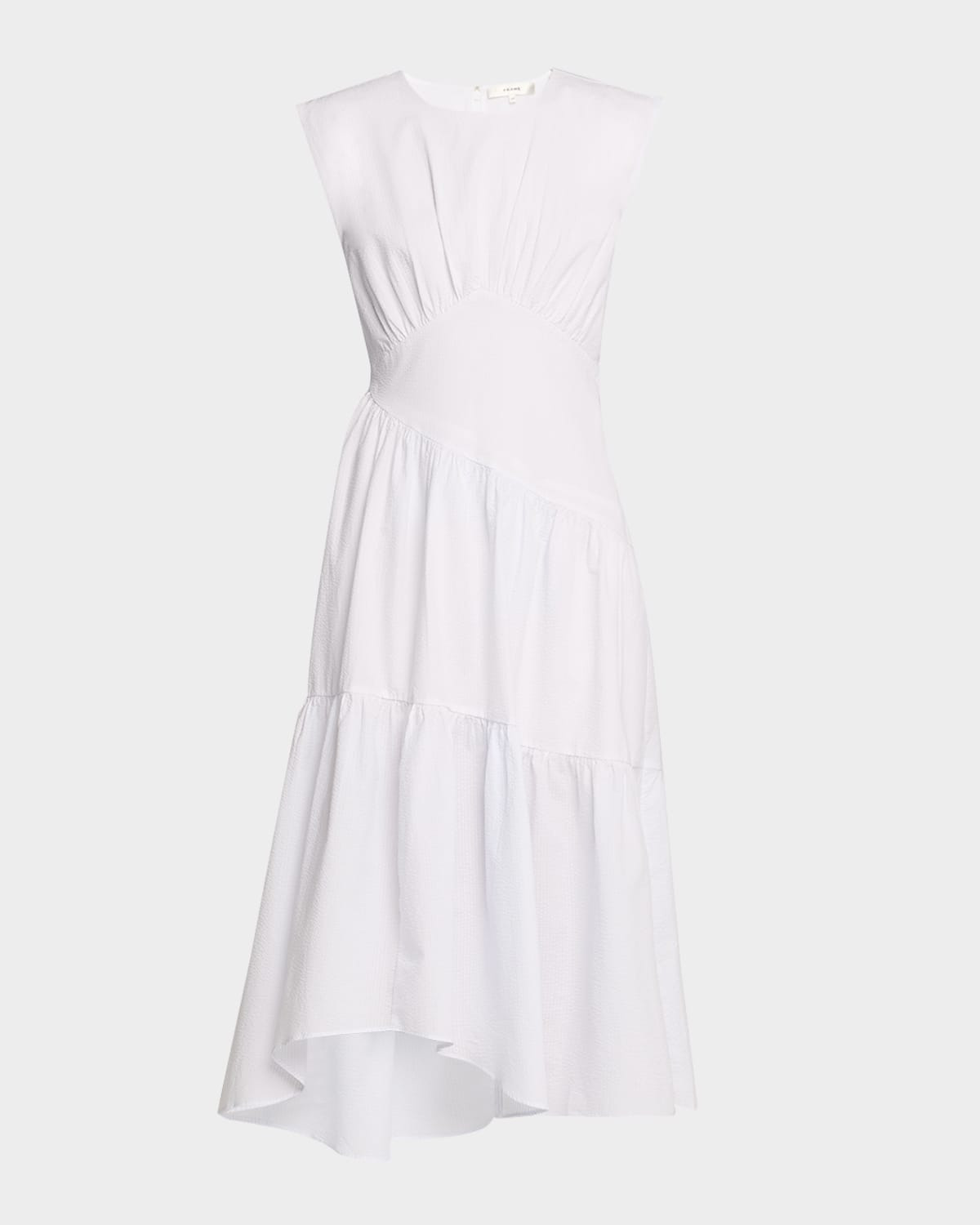 - FRAME "The Seersucker Gathered Seam" midi dress finished with a tiered asymmetric hem - Crew neckline - Cap sleeves - A-line silhouette - Hem falls above the knee - Center back zip - Cotton - Dry clean or hand wash - Imported