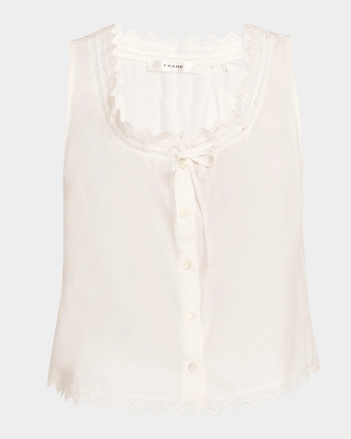 FRAME "Serene" crisp cotton top detailed with delicate scalloped trim & nbsp; Scoop neckline with self-tie & nbsp; Sleeveless & nbsp; Classic fit Hem falls to the hip Pullover style & nbsp; Cotton Imported SIZE & FITModel measurements: 5 & apos;10" tallModel is wearing a US size 4/Small