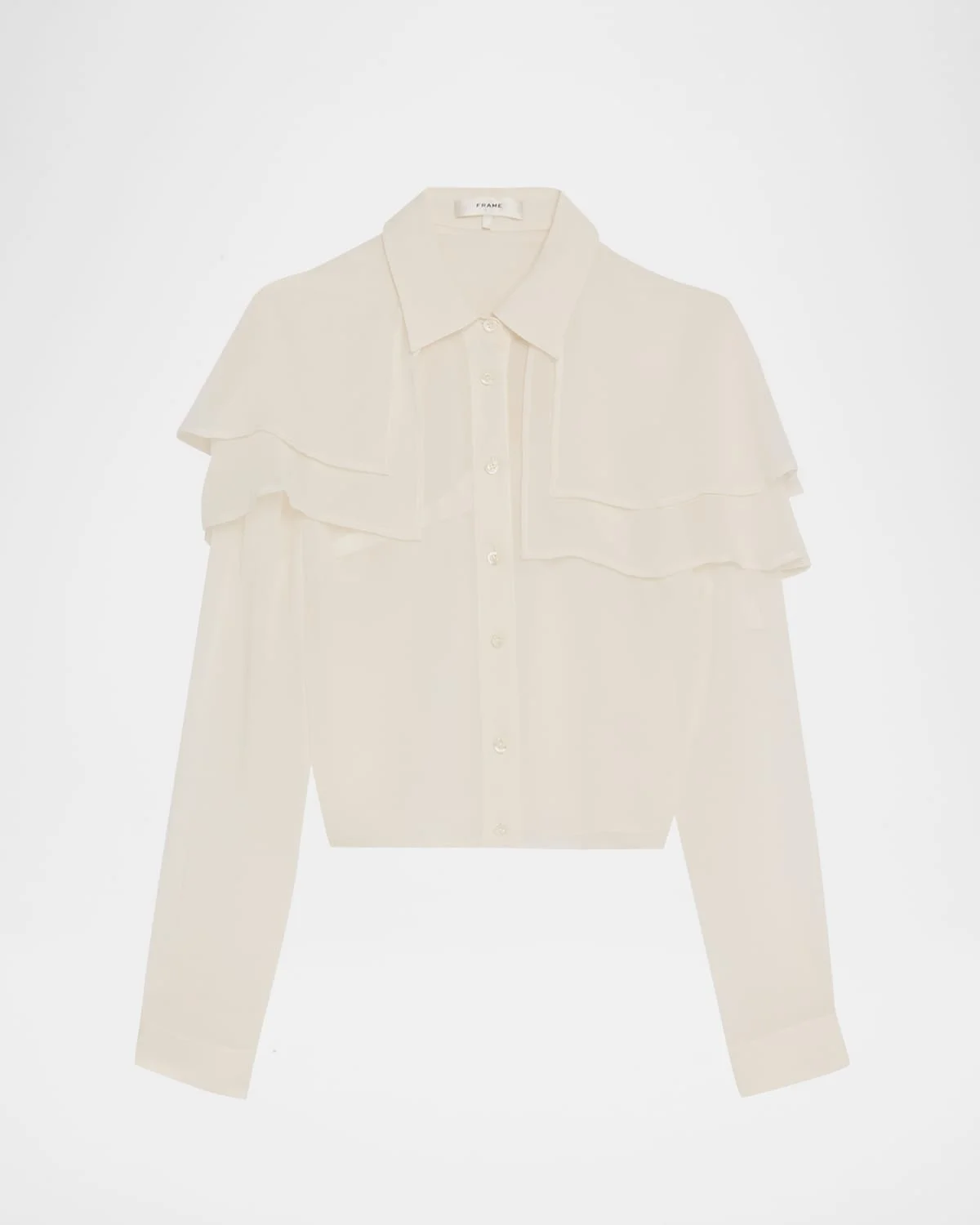 Crafted from semisheer silk, this FRAME blouse features an attached cape that can be removed for versatile styling. Point collar Long sleeves with button cuffs Classic fit Hem falls to the hip Buttonfront Silk Dry clean only Imported