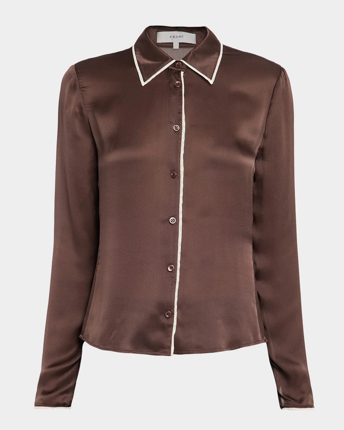 - FRAME essential blouse crafted in luxurious silk and finished with contrast piping - Point collar; button-front - Long sleeves with button cuffs - Slim fit - Hem falls to the hip - Silk - Dry clean - Imported