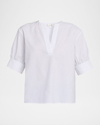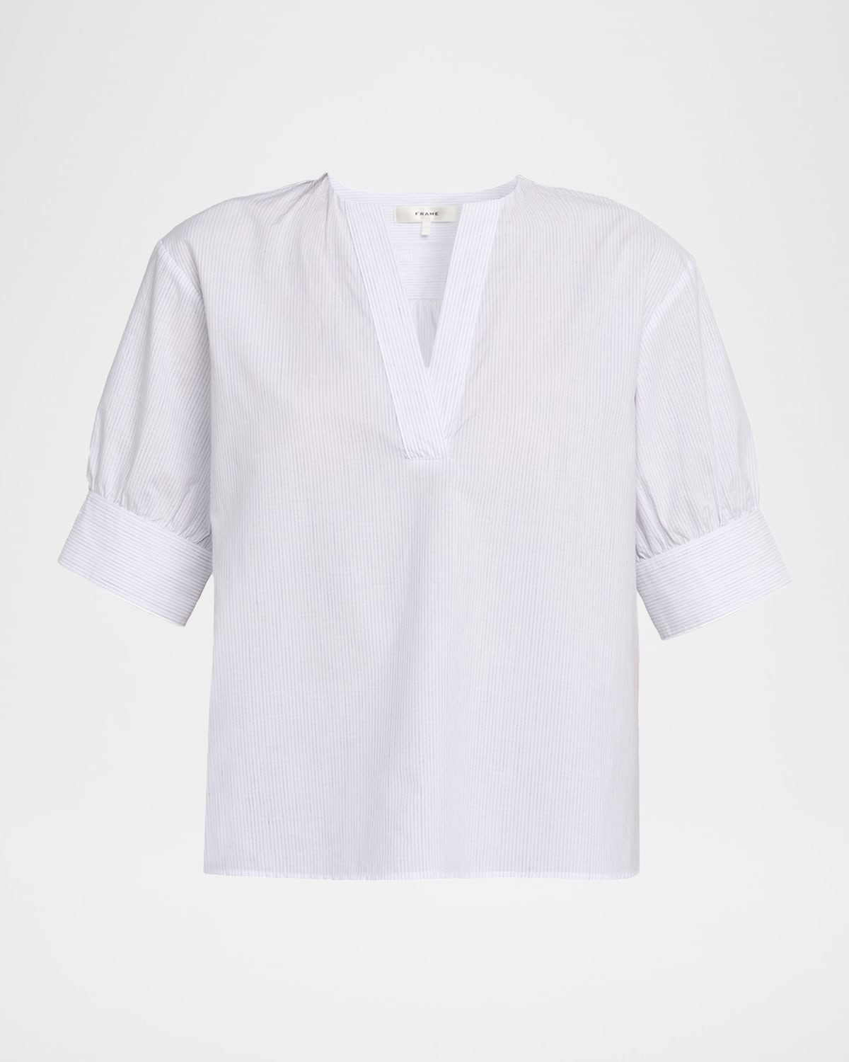 - Crafted from a cotton and linen blend, the V-Neck Popover by FRAME is a go-to piece to complete your seasonal wardrobe. - V neckline - Short sleeves with button cuffs - Classic fit - Hem falls to the hip - Pullover style - Cotton/linen - Machine wash gentle or dry clean - Imported