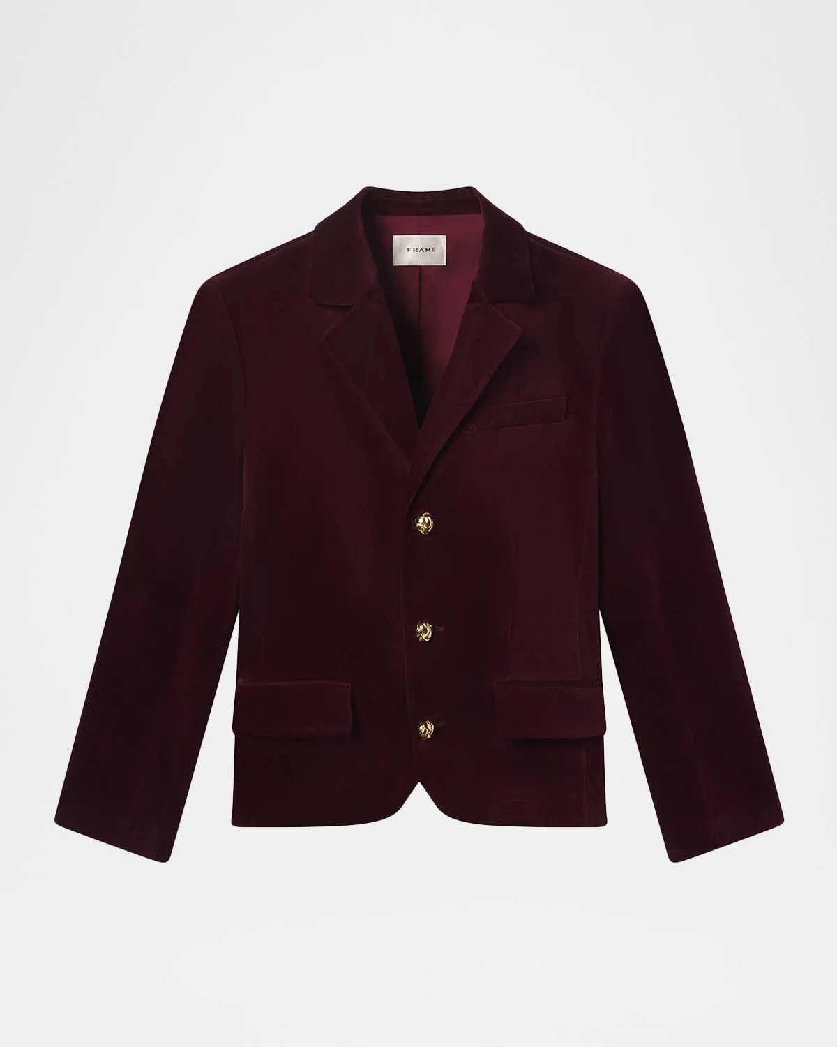Designed in the perfect holiday red hue, this FRAME blazer is crafted from soft stretchvelvet and finished with golden knot buttons for a polished look. Notch lapels Singlebreasted front Structured shoulders Long sleeves with button cuffs Chest welt pocket Hip flap pockets Tailored fit Back vent Buttonfront Cotton/elastane Dry clean Imported