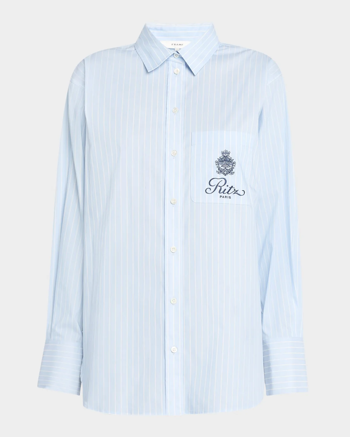 FRAME x Ritz Paris striped shirt featuring an embroidered chest pocket Point collar Dropped shoulders Long sleeves with button cuffs Oversized fit Rounded hem Buttonfront Cotton/nylon/polyamide/spandex Machine wash cold Imported
