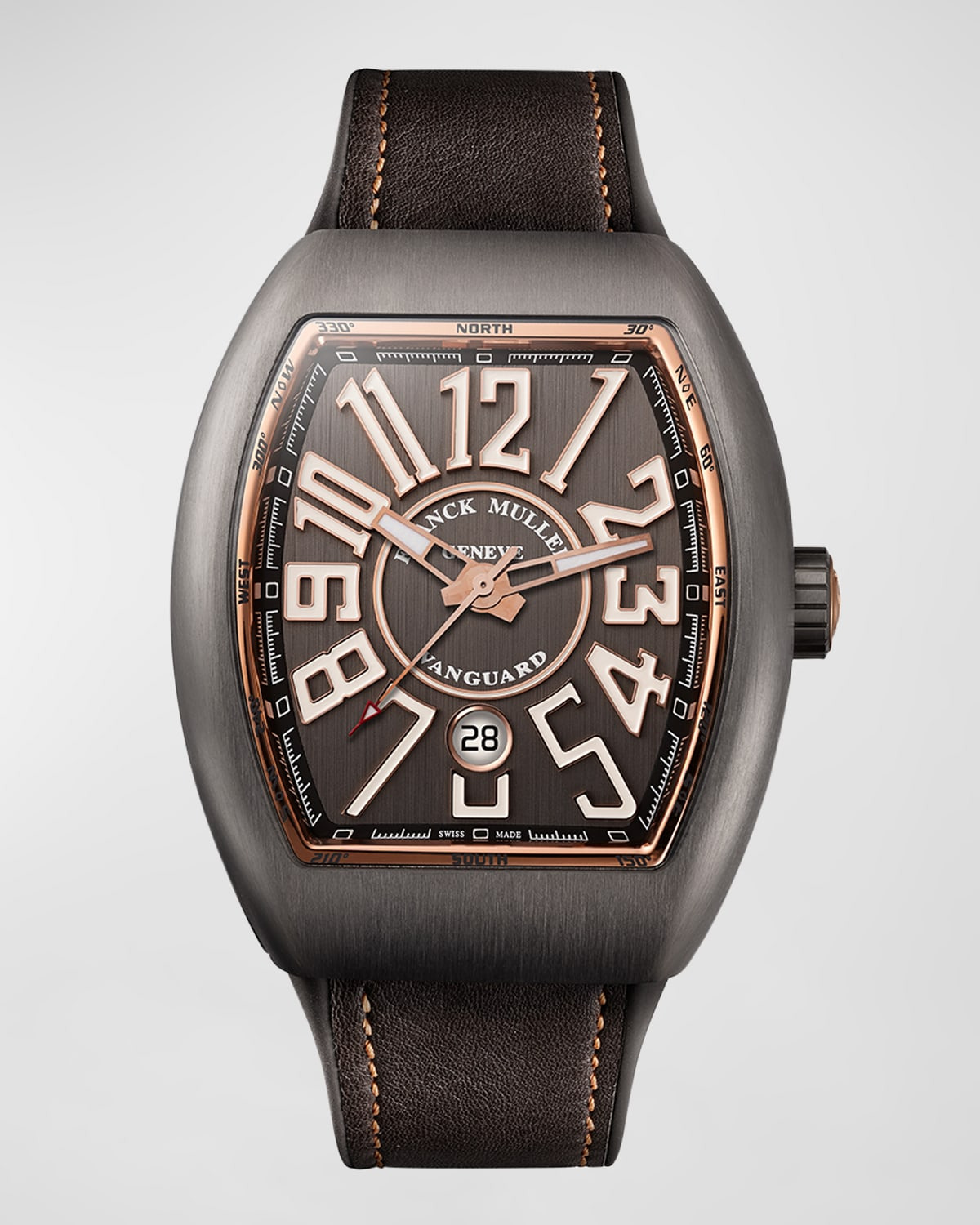 Franck Muller men's watch from the Vanguard collection 41mm tonneaushaped case in a brushed titanium Case and clasp with 18karat rose gold accents Gray dial with Arabic numerals in white Round date window at 6 o'clock index Inner bezel with compass directions Calfskin strap with folding closure Threehand automatic movement Made in Switzerland