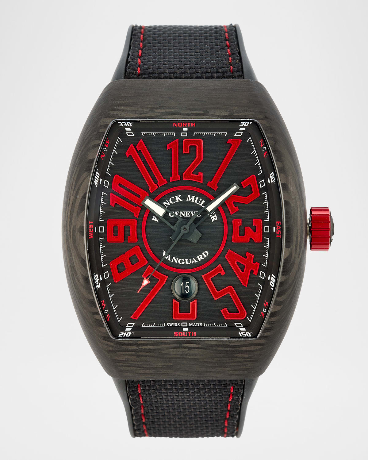 Franck Muller men's watch from the Carbon collection 44mm tonneaushaped case in Aerospacegrade carbon Black dial with Arabic numerals in red Round date window at 6 o'clock index Inner bezel with compass directions Black nylon strap with folding closure Threehand automatic movement Water resistant up to 30 meters Sapphire crystal window 42 hours power reserve Made in Switzerland