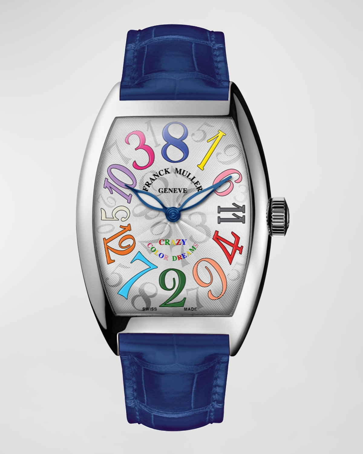 Franck Muller men's watch from the Cintree Curvex Crazy Hours collection Tonneaushaped case in a polished stainless steel Silvertone dial with rainbow Arabic numerals Blue alligator strap with thorn buckle Twohand automatic movement Adjustable length Made in Switzerland
