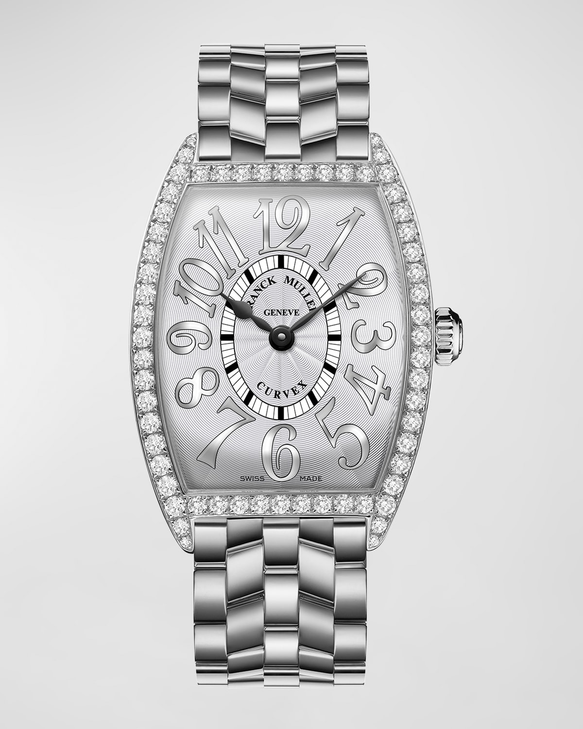 • Franck Muller watch from the Cintrée Curvex collection • Tonneau-shaped case in polished stainless steel • Five-link bracelet strap with folding closure • White dial with vibrant numeral design • Bezel decorated with white diamonds • Two-hand quartz movement • Total carat weight: 1.05 • Made in Switzerland Online Inquiries: NMS21_PET65 Store Inquiries: #4475590