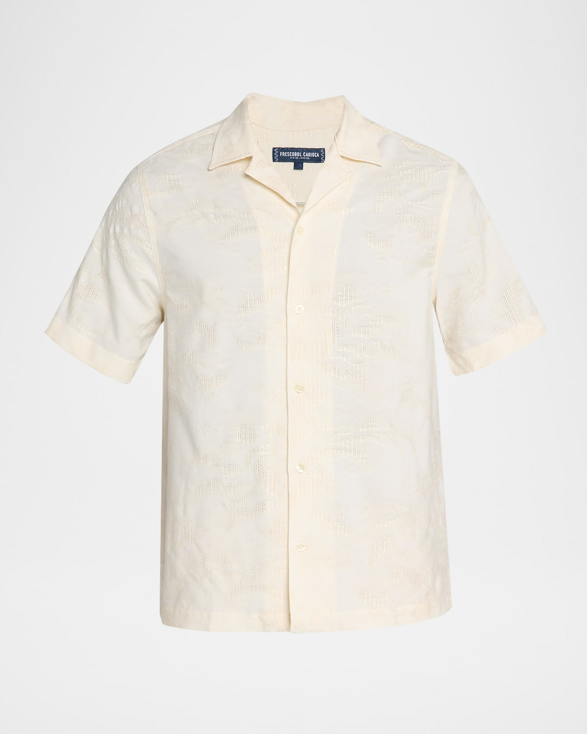 - Frescobol Carioca "Franca" camp shirt elevated with an intermittent jacquard weave, reminiscent of rattan - Approx. 18.1 - "L from shoulder to hem - Notch collar - Button front - Short sleeves; approx. 9.8"L - Box pleated back yoke - Vented sides - Relaxed fit - Cotton/viscose - Unlined - Machine wash cold - Made in Portugal