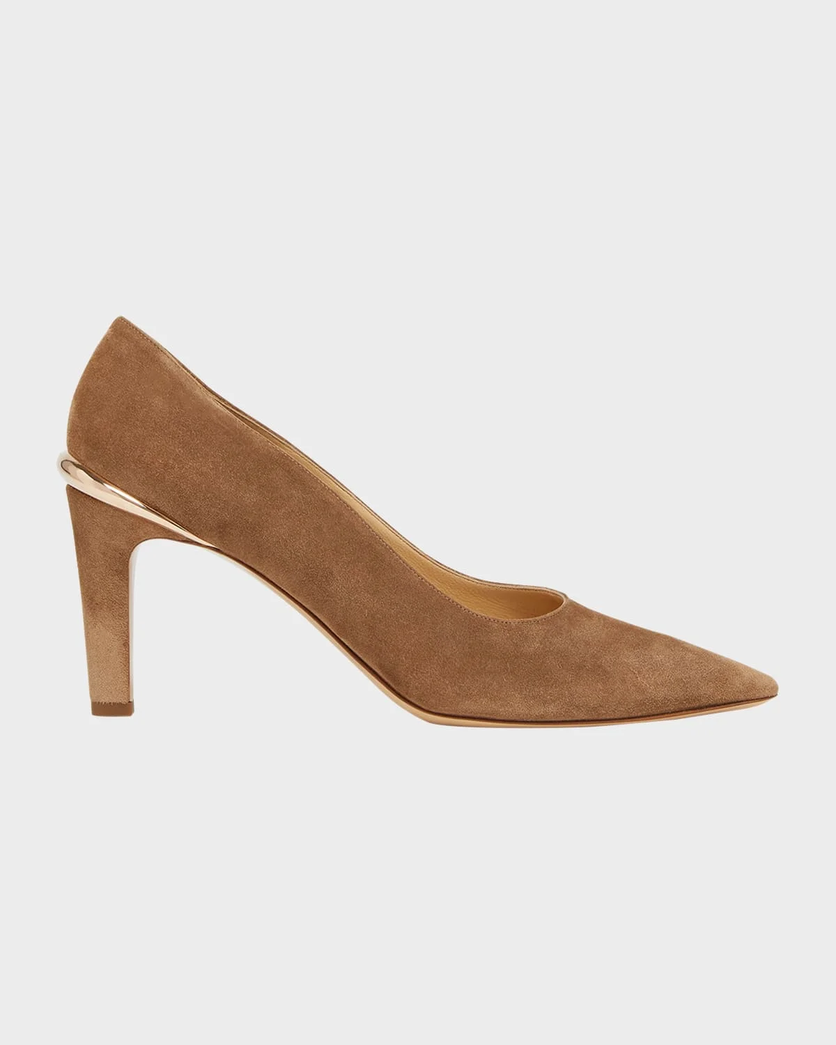 The "Edwina" pumps from Gabriela Hearst are crafted from Italian calf suede with a goldbrass detail 3.00 in / 75 mm covered stiletto heel Pointed toe Slipon style Leather lining and outsole Made in Italy