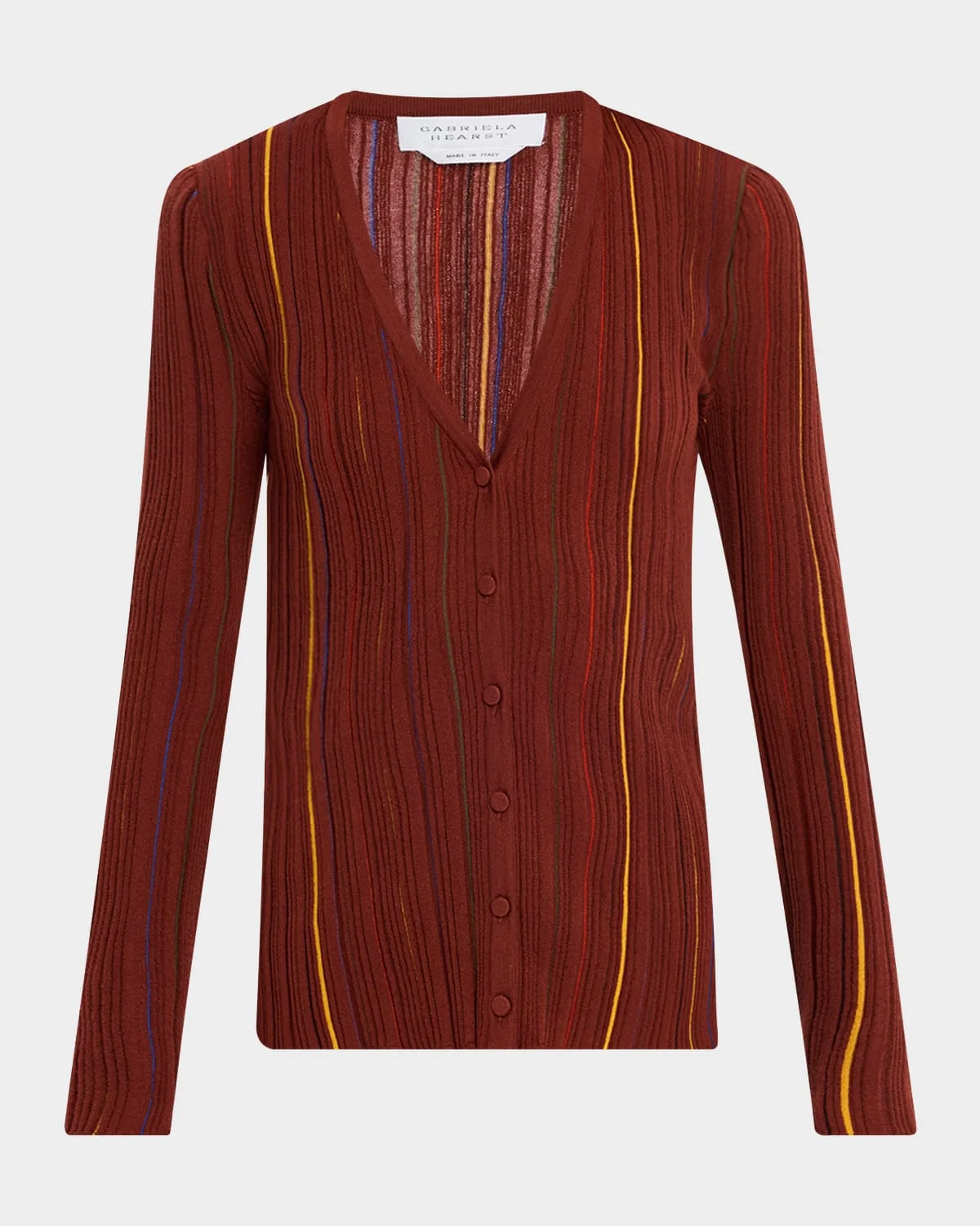 - Gabriela Hearst "Barth" cardigan in pinstripe plisse knit - V neckline; button front - Long sleeves - Fitted - Merino wool - Dry clean - Made in Italy