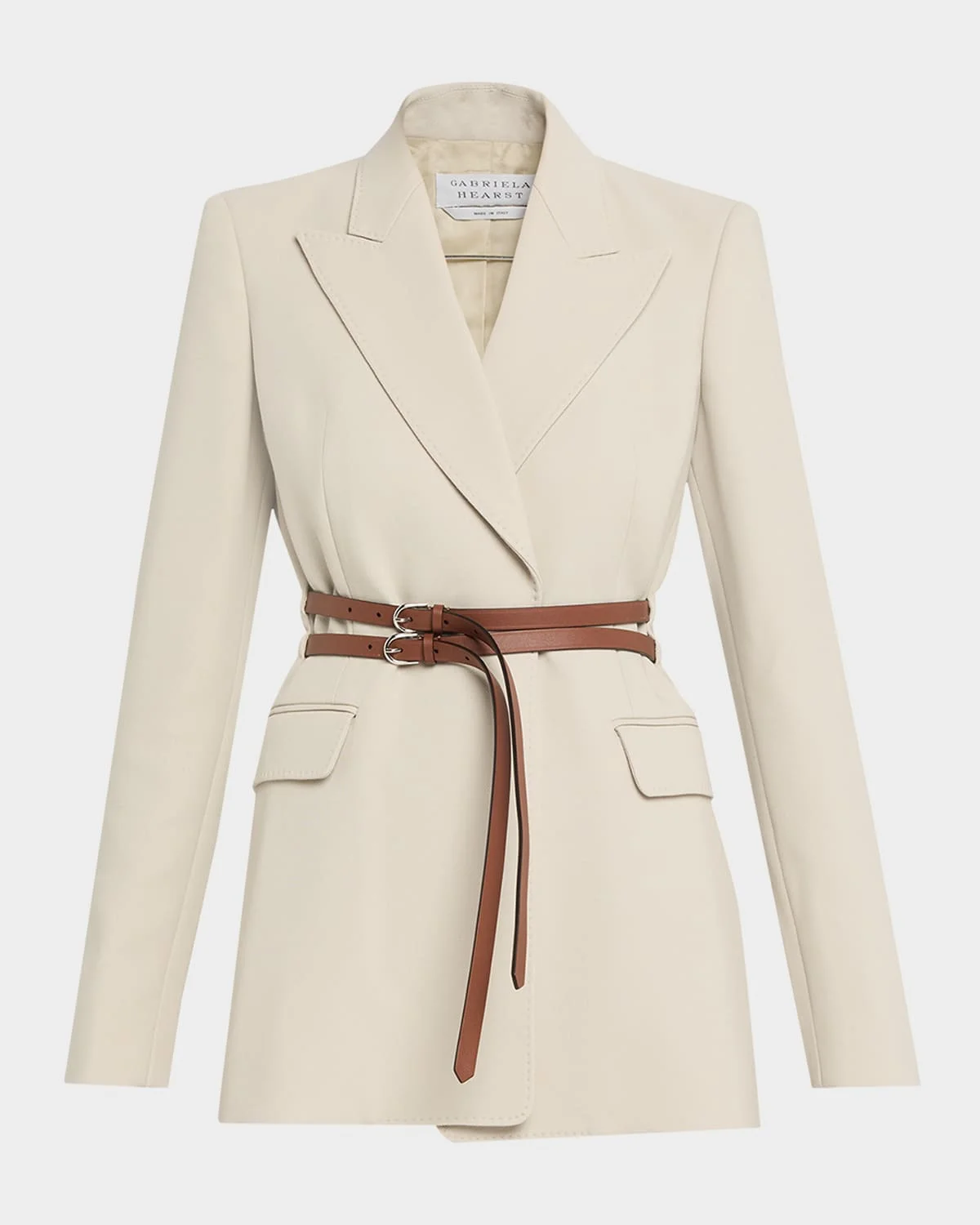 Gabriela Hearst "Daniel" wrap blazer jacket is crafted from a wool crepe tailored with topstitching and is cinched at the waist with a calfskin leather wrap belt Peak lapels; singlebreasted front Long sleeves; button cuffs Padded shoulders Slim fit Hem falls below the hip Walking vent back Wool/leather Lining: Cupro Made in United Kingdom