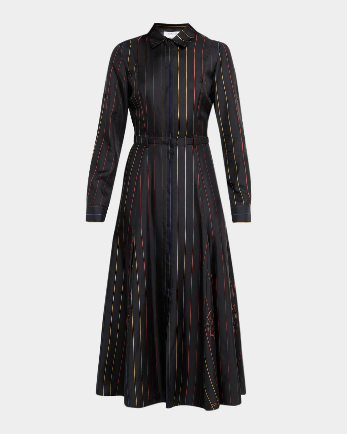 Gabriela Hearst shirtdress crafted in flowy silk with a multicolor pinstriped motif and cinched with a waist sash Point collar; concealed button front Long sleeves; rolltab cuffs Yoked back; inverted pleat Selftie belted waist Side split pockets Aline silhouette Hem falls below the knee Silk Made in Italy