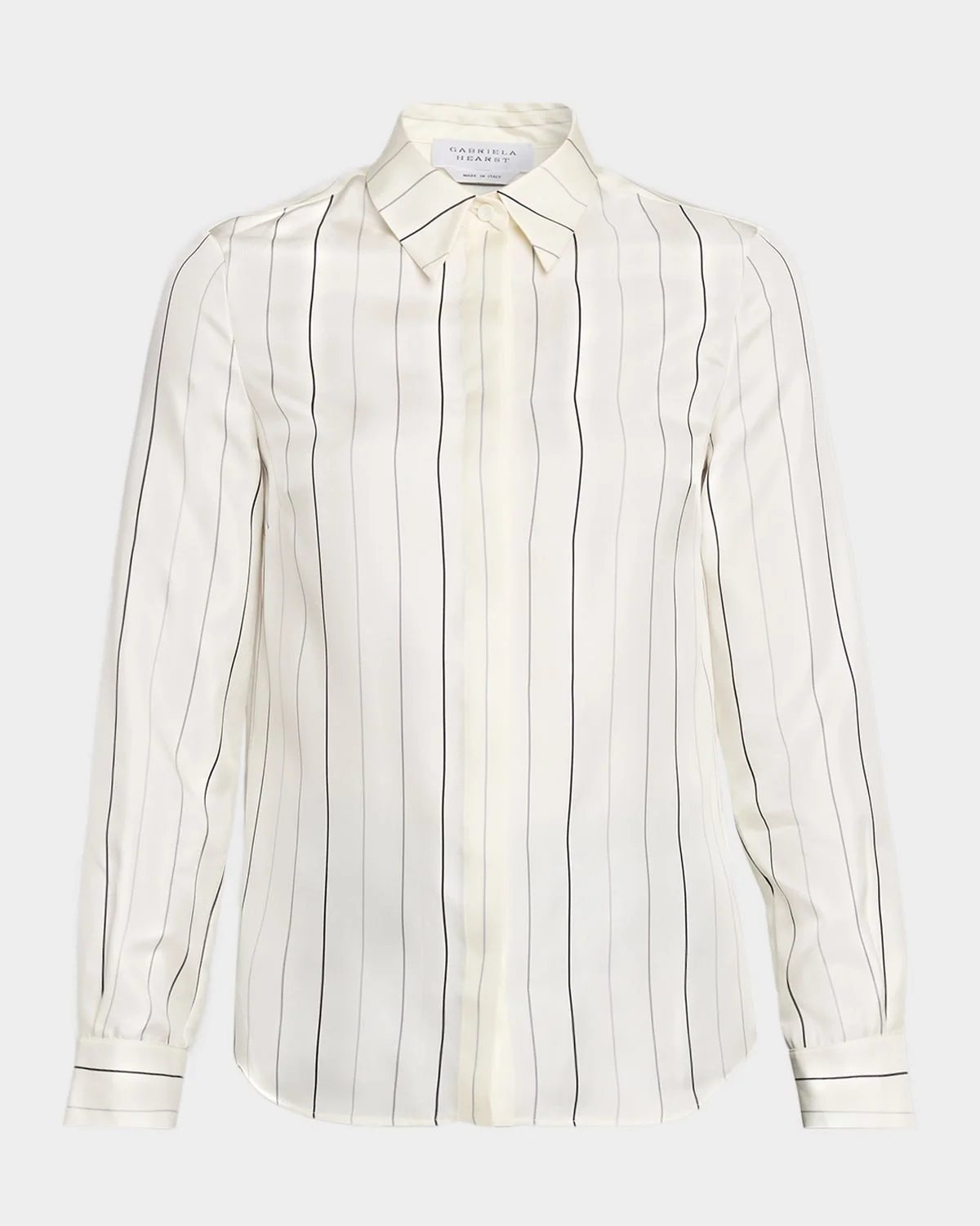 Gabriela Hearst "Henri" blouse is finished in a rainbow pinstripe silk Point collar; concealed button front Long sleeves; button cuffs Yoked back; box pleat Relaxed fit Shirttail hem Silk Made in Italy