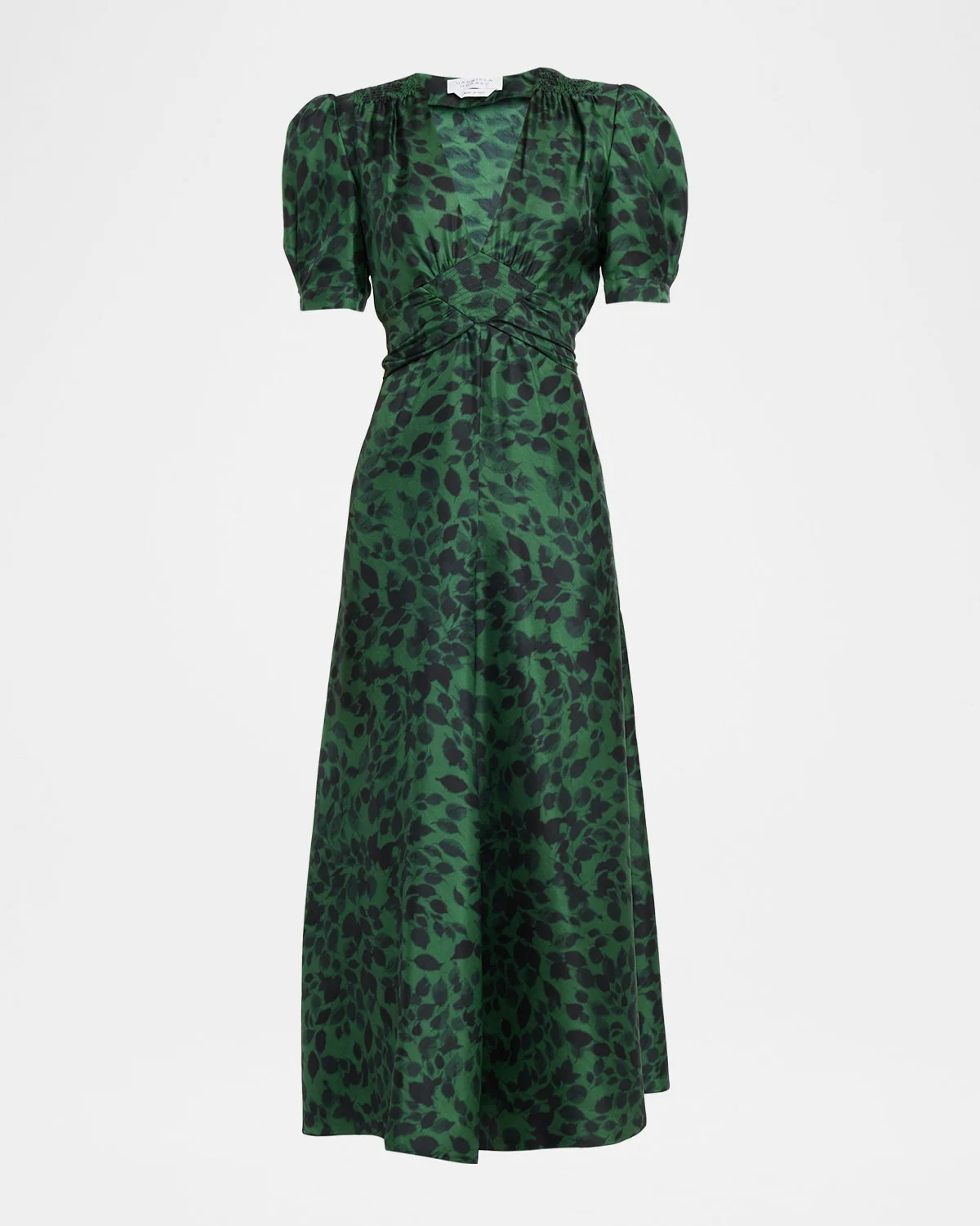 Gabriela Hearst "Larkin" dress is crafted from leaf-printed silk satin accented with an empire waist with a waist sash and puff sleeves V neckline Short sleeves; self-tie cuffs Empire waist Self-tie waist sash A-line silhouette Hem falls below the knee Invisible side zip Silk Made in Italy