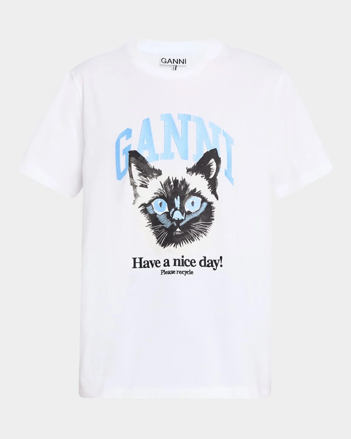 Ganni jersey graphic tshirt featuring a cat logo motif Crew neckline Short sleeves Relaxed fit Hem falls to the hip Pullover style Cotton Dry clean Imported