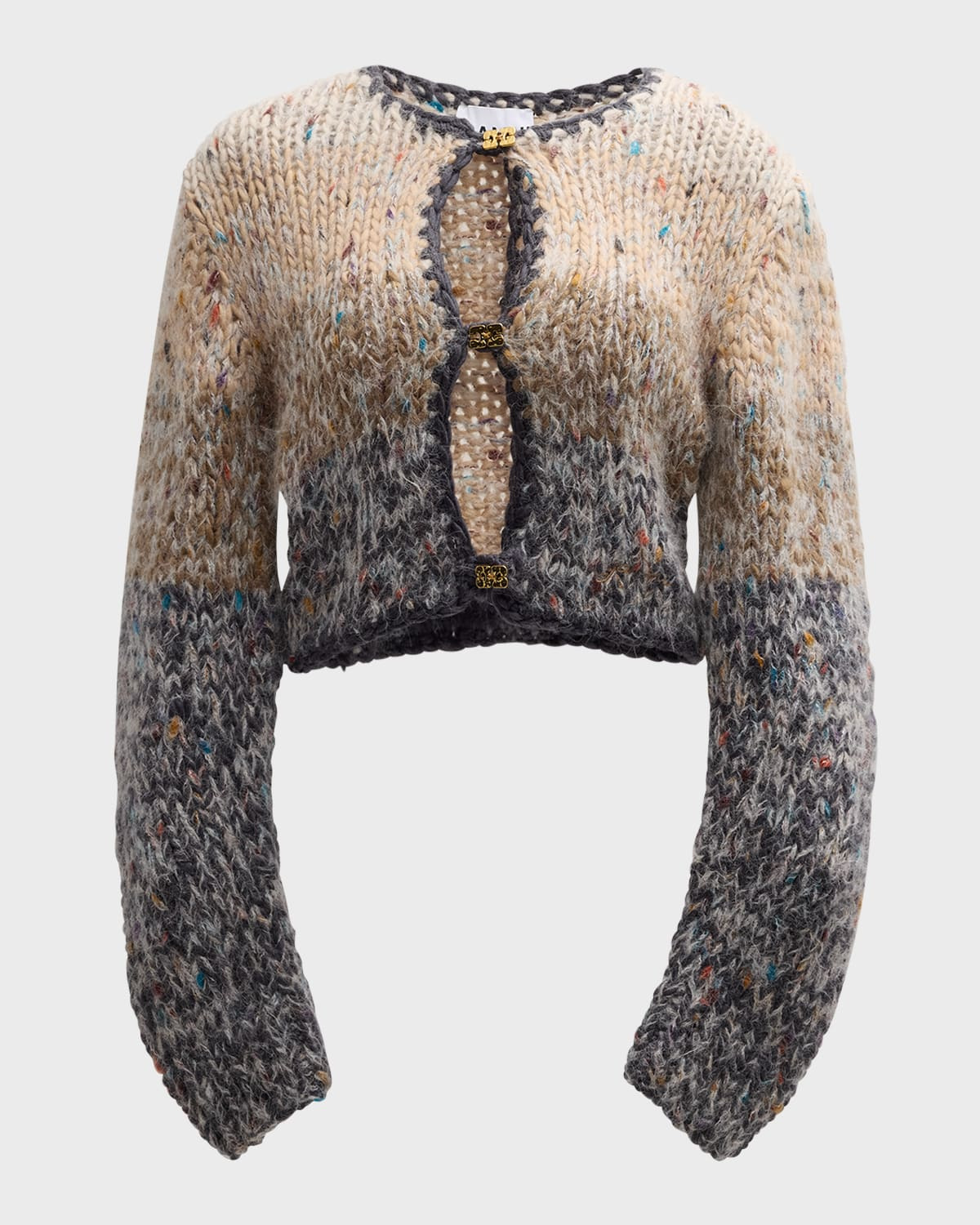 Ganni chunky marled handknit cardigan featuring signature logo buttons Round neckline Long sleeves Cropped fit Hem sits at the hip Buttonfront Polyester Dry clean Imported