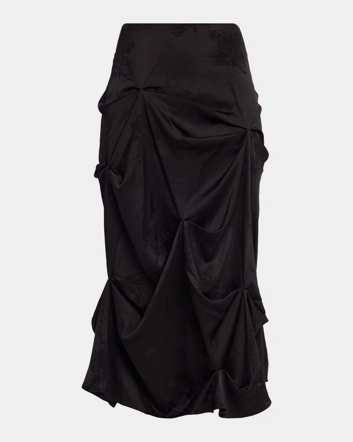 Crafted from fluid satin jacquard, this Ganni skirt features elegant draping and a tonal floral motif throughout. High rise Slip silhouette Hem falls below the knee Side zip Acetate/polyester Dry clean Imported