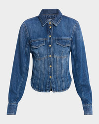 - Ganni lightweight denim shirt featuring corset-style seams - Point collar - Long sleeves with snap cuffs - Dual chest pockets - Fitted - Rounded hem - Snap-front - Polyester/nylon/polyamide/elastane - Machine wash cold - Imported