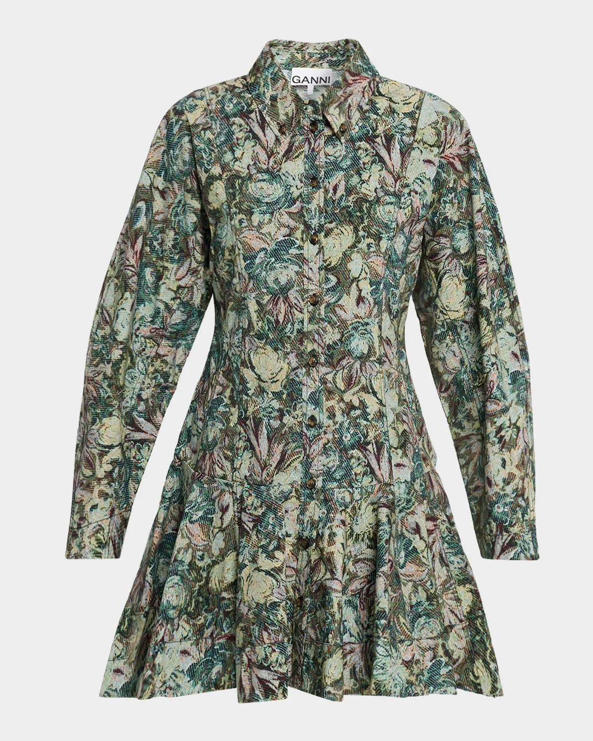 Adorned with a tapestry floral print, this Ganni mini dress boasts a dropwaist silhouette, finished with a ruffled hem for a feminine touch. Point collar Long sleeves with button cuffs Shirtdress silhouette Hem falls above the knee Buttonfront Cotton/elastane Machine wash cold Imported