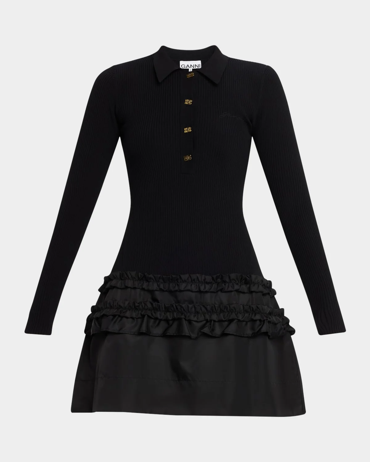 Finished with signature golden logo buttons, this melange mini dress from Ganni is designed with a ribbed bodice and a satin frills at the skirt. Spread collar Long sleeves Dropwaist silhouette Hem falls above the knee Slipover style Viscose/nylon/polyamide/elastane Hand wash Imported