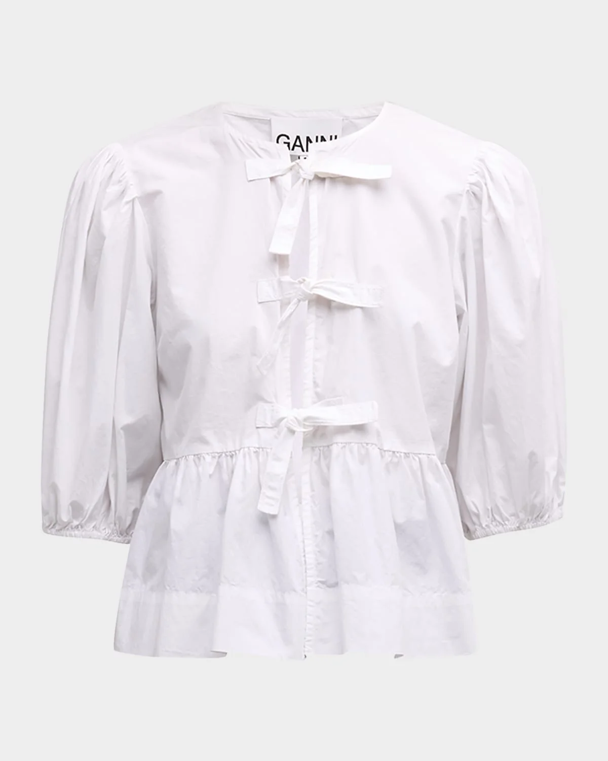 Ganni poplin fronttie peplum blouse with pleating throughout Crew neckline Short puffedsleeves; elastic cuffs Blouson fit Hem sits at the hip Organic cotton Machine wash Imported