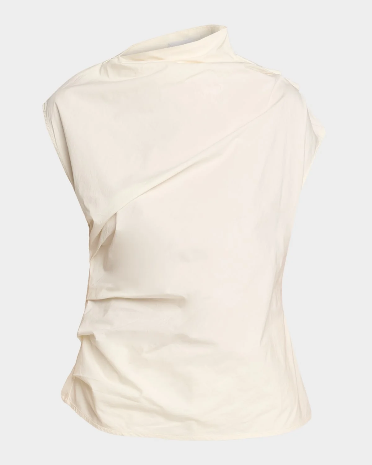 Crafted from organic cotton, this Ganni blouse exhibits flattering ruching and a twisted, cutout back. Asymmetric neckline Sleeveless Slim fit Hem sits at the hip Side zip Cotton/elastane Machine wash cold Imported