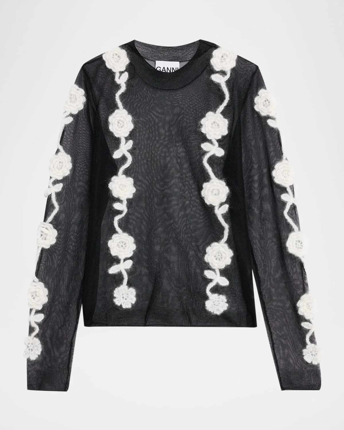 Crafted from sheer mesh, this Ganni top is adorned with floral crochet detailing that trails down the silhouette. High neckline Long sleeves Relaxed fit Hem sits at the hip Pullover style Nylon/polyamide/mohair/wool Unlined Dry clean Imported