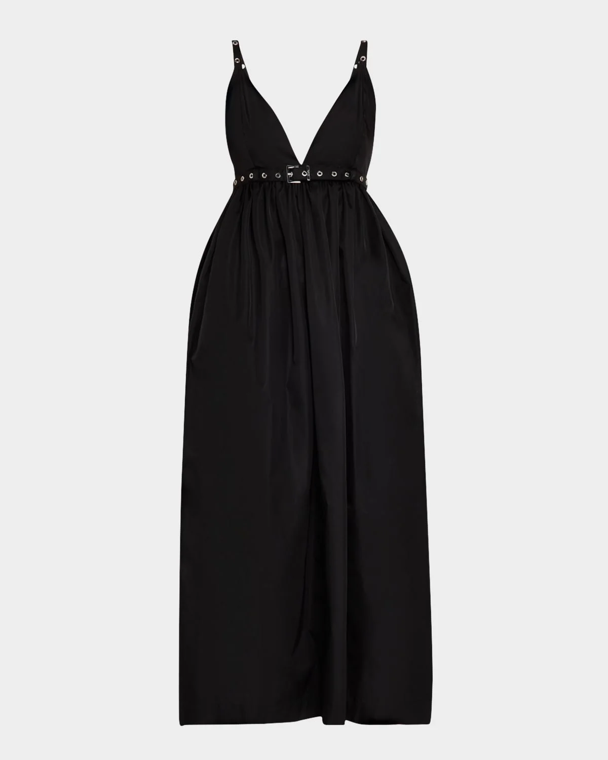 - Ganni midi dress featuring an adjustable belted waist - Plunging V neckline - Sleeveless - Side seam pockets - Empire-waistline - Hem falls below the knee - Slipover style - Polyamide/polyurethane - Machine wash cold - Imported