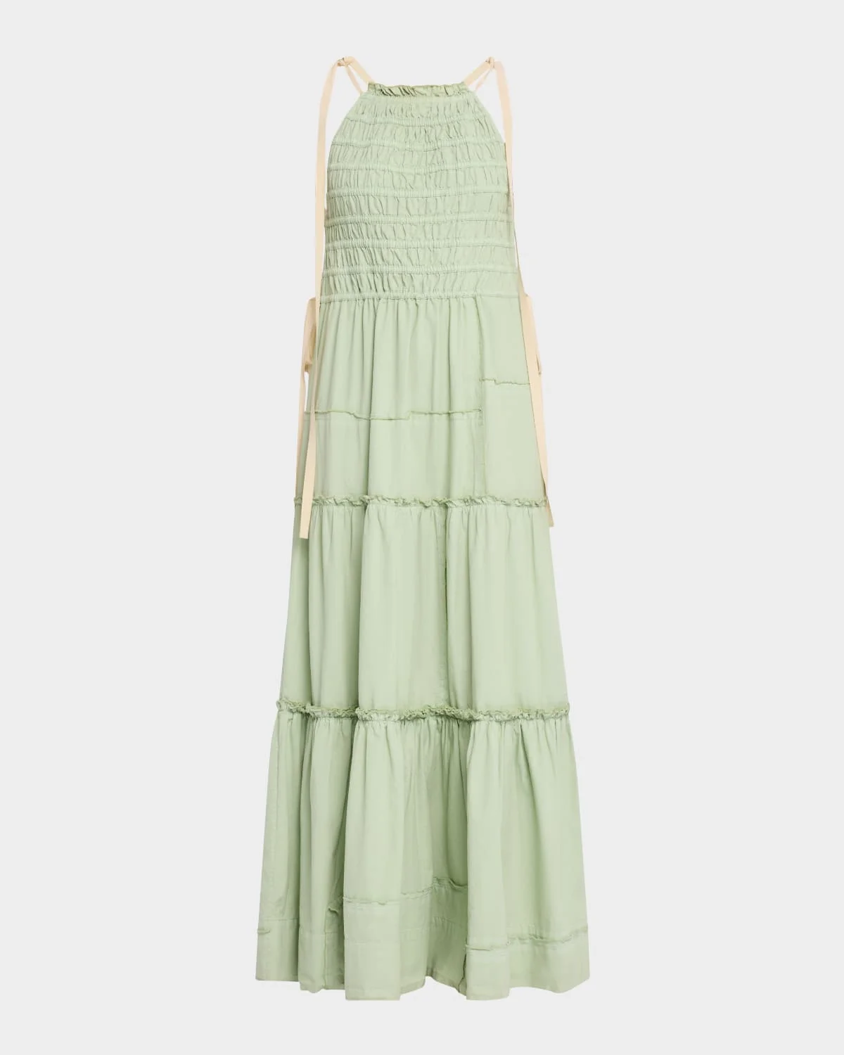 - Ganni smocked cotton-twill maxi dress finished with self-tie shoulders - High neckline - Sleeveless - Tiered A-line silhouette - Full length - Slipover style - Organic cotton - Imported