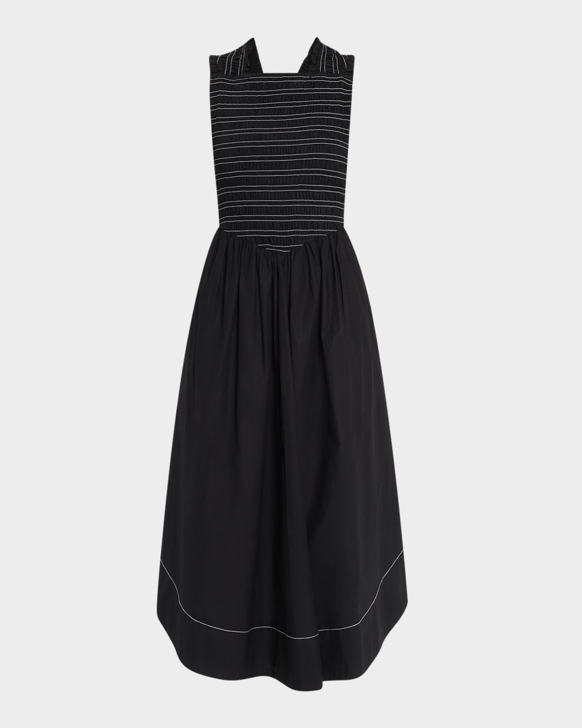- Ganni stretch cotton midi dress featuring a smocked bodice with contrast topstitching - High square neckline - Sleeveless - Crisscross back - Side pockets - A-line silhouette - Hem falls below the knee - Slipover style - Organic cotton - Machine wash cold - Imported