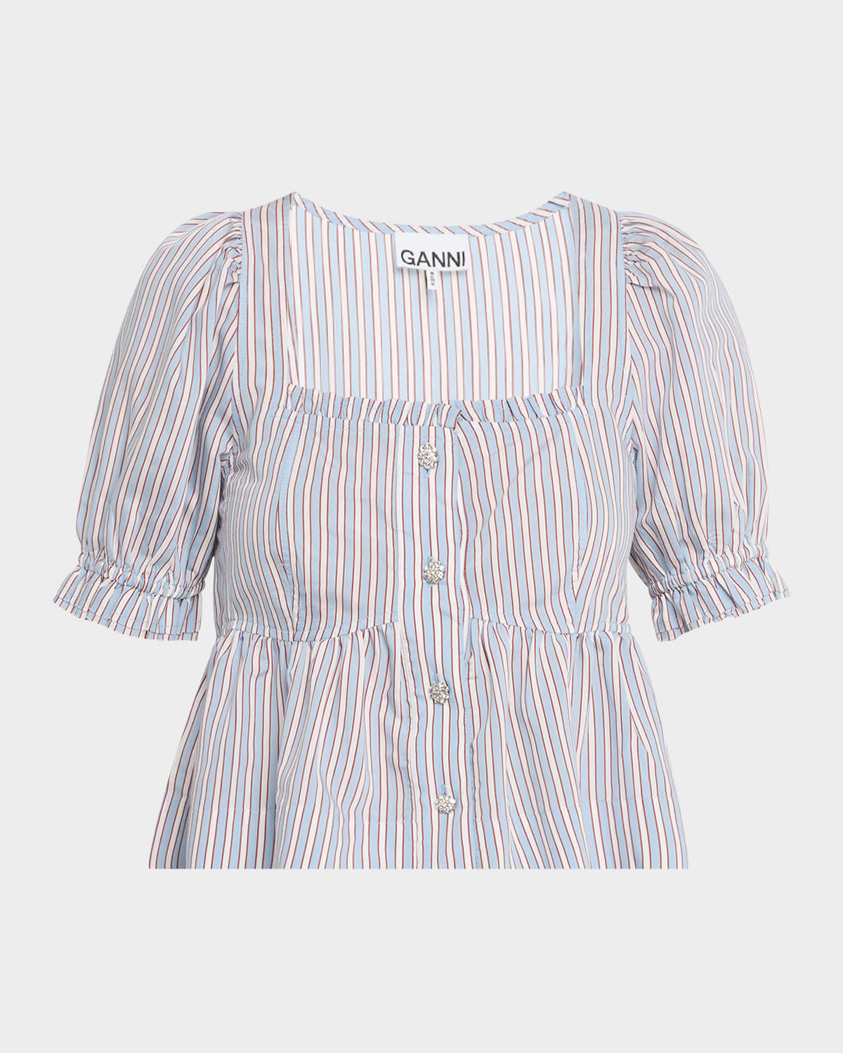 - Ganni stripe blouse featuring rhinestone-embellish buttons - Square neckline - Short puff sleeves - Classic fit - Peplum hem - Organic cotton/elastane - Machine wash cold - Imported