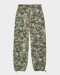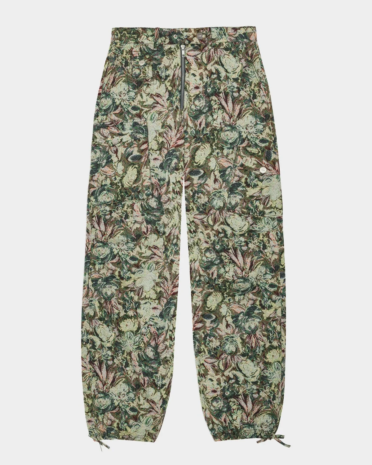 Crafted from cotton twill, these Ganni pants feature an intricate tapestry motif and ample cargo pockets for all your necessities. Midrise; sits high on the hip Side slash pockets; back flap pockets Drawstring hem Exposed zip fly; belt loops Organic cotton/elastane Machine wash cold Imported