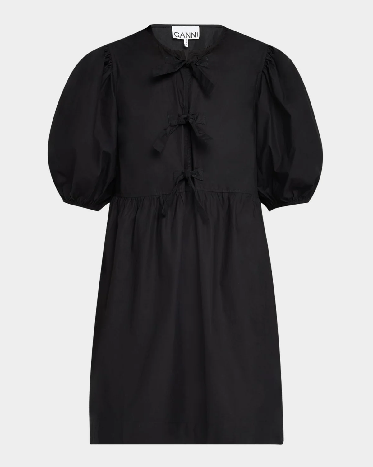 - Ganni cotton-poplin mini dress featuring a tie-front bodice - Crew neckline - Short puffed sleeves - Empire waist - Hem falls above the knee - Slipover style - Organic cotton - Machine wash cold - Imported