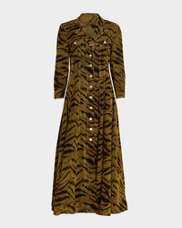 Crafted in tigerprint denim, this Ganni maxi dress is adorned with figureflattering seams that frame the silhouette. Notched collar Bracelet sleeves with button cuffs Dual chest pockets Side slip pockets Classic fit Full length Buttonfront Viscose/elastane Dry clean Imported