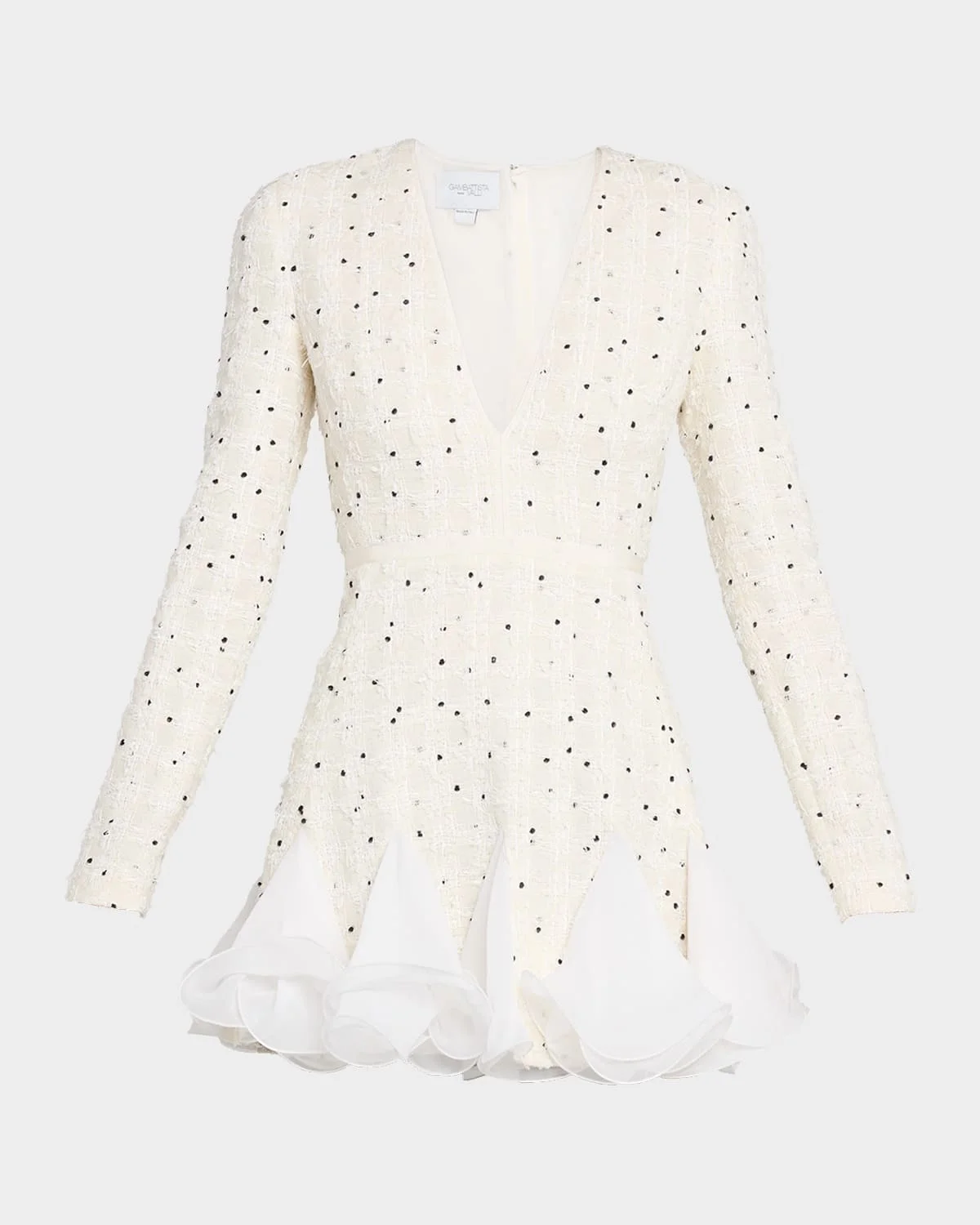 - Giambattista Valli polka-dot boucle dress featuring ruffle skirt godets - V neckline - Long sleeves - Fit-and-flare silhouette - Mini length - Back zip - Silk/cotton - Made in Italy