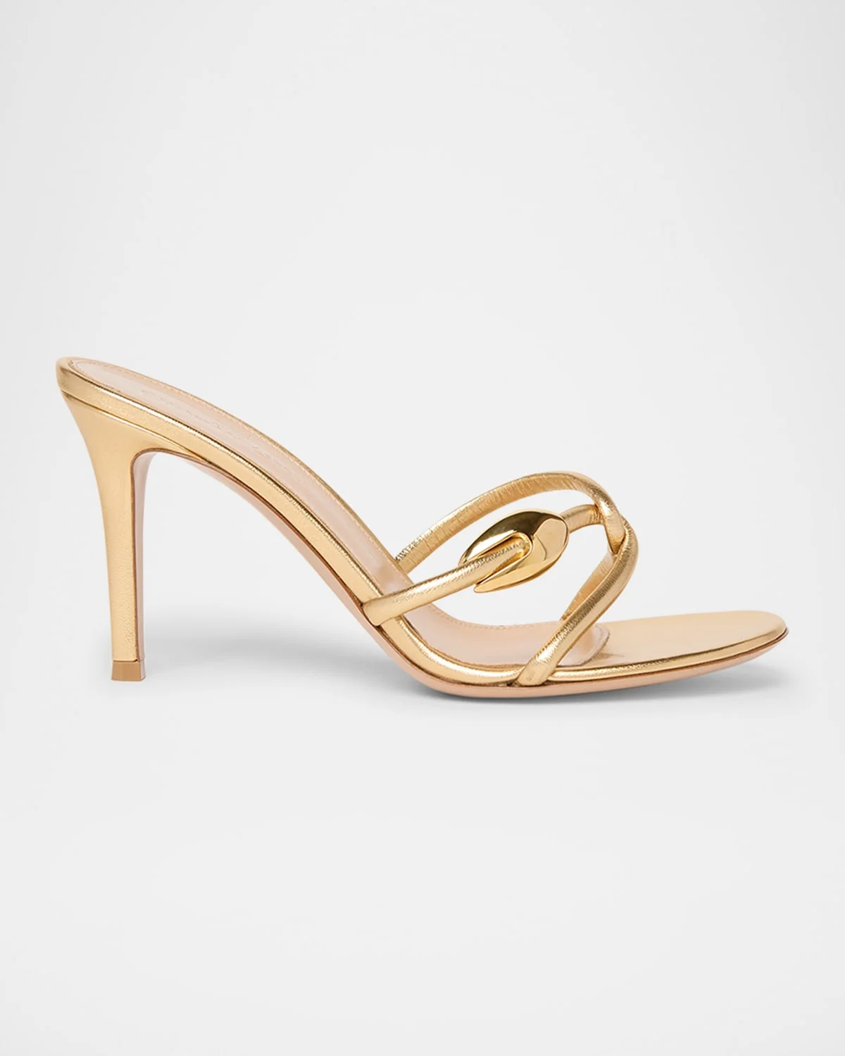 Gianvito Rossi strappy metallic leather sandals with golden serpent accent 3.25 in / 85 mm stiletto heel Open toe Twisted, caged vamp Adjustable ankle strap Smooth sole Made in Italy