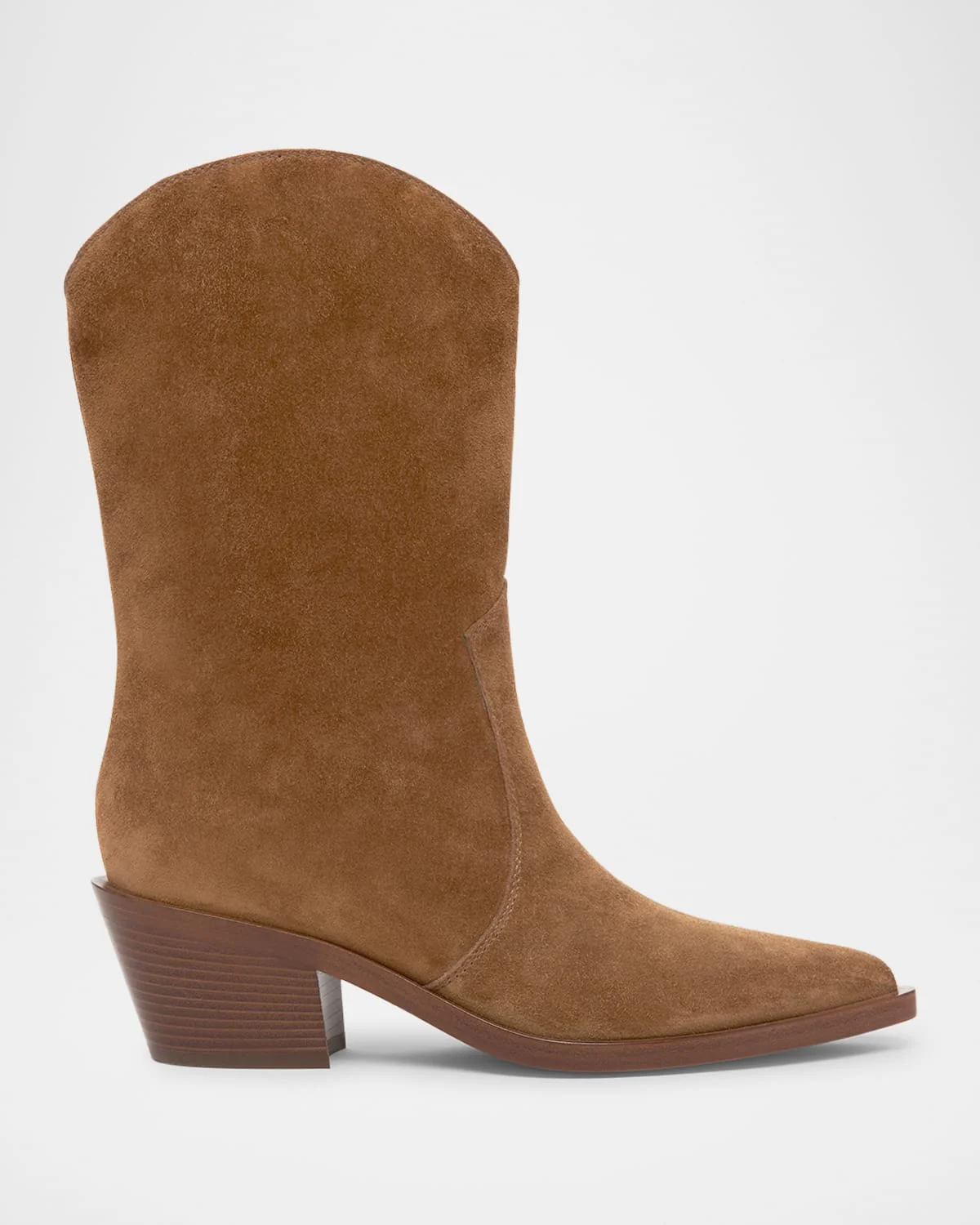 - Gianvito Rossi soft suede short cowboy boots - 1.75 in / 45 mm block heel - Pointed toe - Curved collar - Pull-on style - Leather outsole - Made in Italy