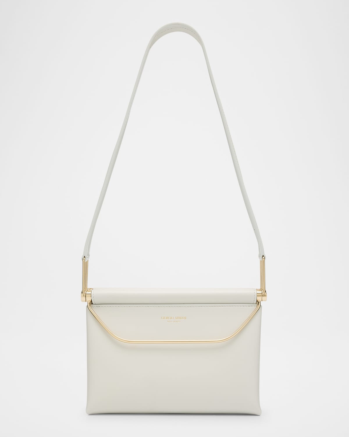 - Giorgio Armani "Avenue" shoulder bag in polished leather - Metal top handles - Shoulder straps - Can be worn as a clutch, top handle, or shoulder bag - Framed top - Interior, one slip pocket - Approx. 5.7"H x 8.3"W x 3.3"D - Made in Italy